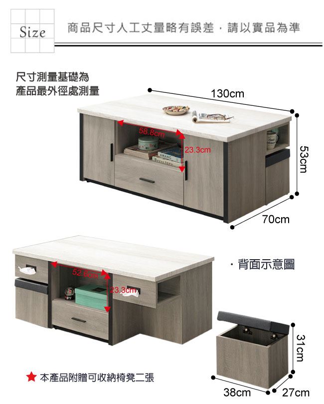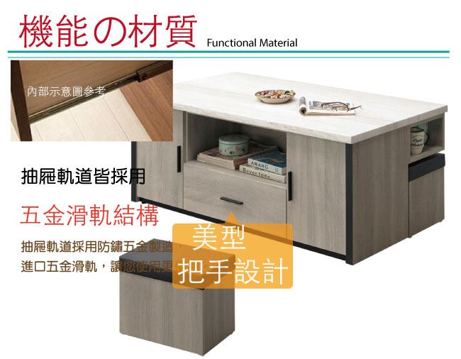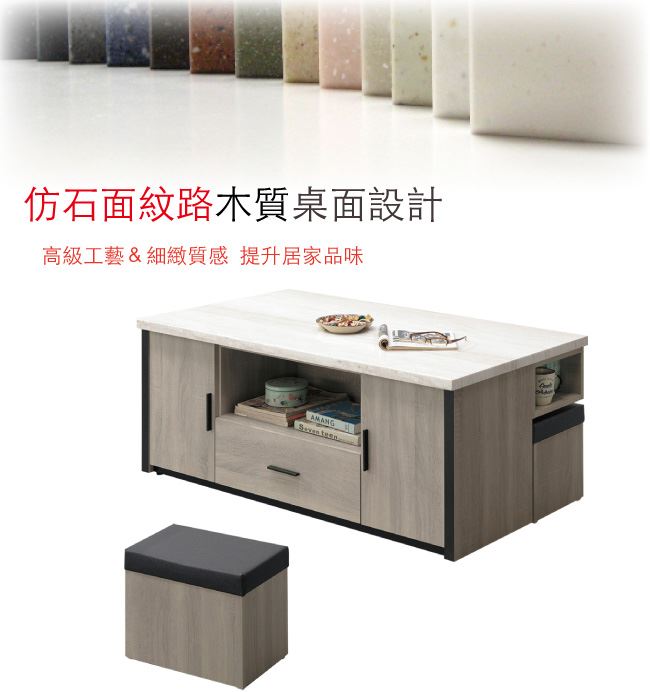 材質 | ◆產品名稱:【綠家居】 烏茲 時尚4.3尺仿雲紋木質大茶几(附贈二張收納椅凳) 尺寸:(寬)130x(深)70x(高)53/公分 ◆材質: 材質:防蛀木心板+五金滑軌結構+仿雲紋石面紋路木質桌面板 |
