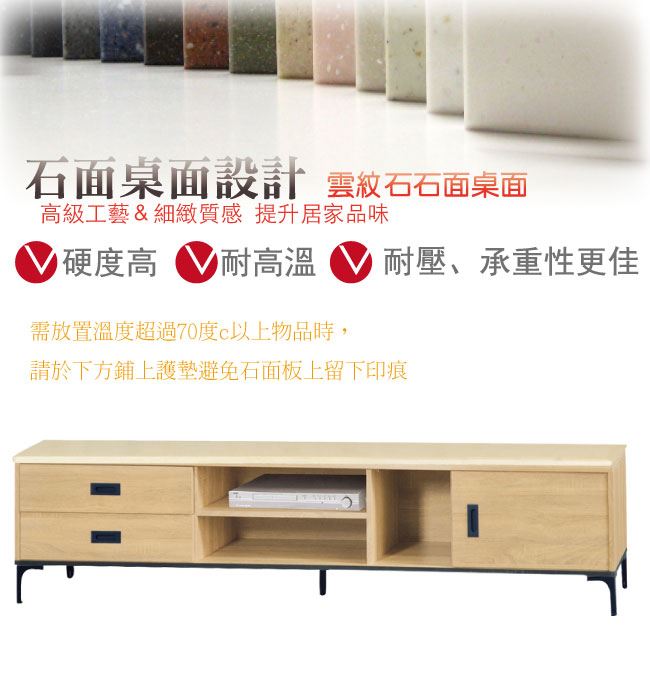 商品介紹 | 【綠家居】巴洛納 單門7尺石面二抽電視櫃(二色石面可選) 原橡木紋色系+三色石面可選+現代簡約風格+安心材質製造,整體採用防蛀木心板+黑鐵砂框架&腳座+五金滑軌結構+12mm雲紋石面板等安心材質製造,產品外層採用防潮耐磨噴漆處理搭配採用開門櫃+二抽屜+開放式層格收納等收納空間設計,全由專人配送到家,專業安心服務,替你省下更多時間! 【商品特色】 原橡木紋色系+三色石面可選+現代簡約風格+安心材質製造,使用放心+搭配居家更便利 採用防蛀木心板+黑鐵砂框架&腳座+五金滑軌結構+12mm雲紋石面板等安心材質製造 產品外層採用防潮耐磨噴漆處理 搭配採用開門櫃+二抽屜+開放式層格收納等收納空間設計 此商品不需要DIY組立,此商品為組立後之成品 品質保證、專業設計、貼心服務 全由專人配送到家,專業安心服務,替您省下更多時間 |