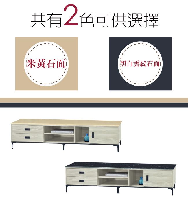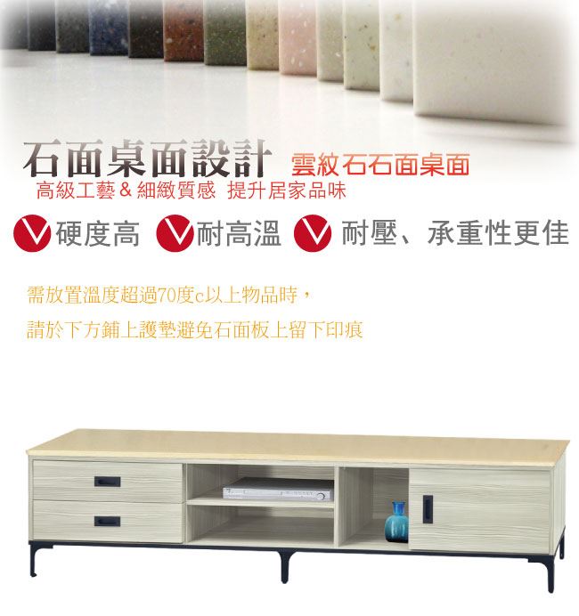 商品介紹 | 【綠家居】多巴納 單門7尺石面二抽電視櫃(二色石面可選) 雪松木紋色系+三色石面可選+現代簡約風格+安心材質製造,整體採用防蛀木心板+黑鐵砂框架&腳座+五金滑軌結構+12mm雲紋石面板等安心材質製造,產品外層採用防潮耐磨噴漆處理搭配採用開門櫃+二抽屜+開放式層格收納等收納空間設計,全由專人配送到家,專業安心服務,替你省下更多時間! 【商品特色】 雪松木紋色系+三色石面可選+現代簡約風格+安心材質製造,使用放心+搭配居家更便利 採用防蛀木心板+黑鐵砂框架&腳座+五金滑軌結構+12mm雲紋石面板等安心材質製造 產品外層採用防潮耐磨噴漆處理 搭配採用開門櫃+二抽屜+開放式層格收納等收納空間設計 此商品不需要DIY組立,此商品為組立後之成品 品質保證、專業設計、貼心服務 全由專人配送到家,專業安心服務,替您省下更多時間 |