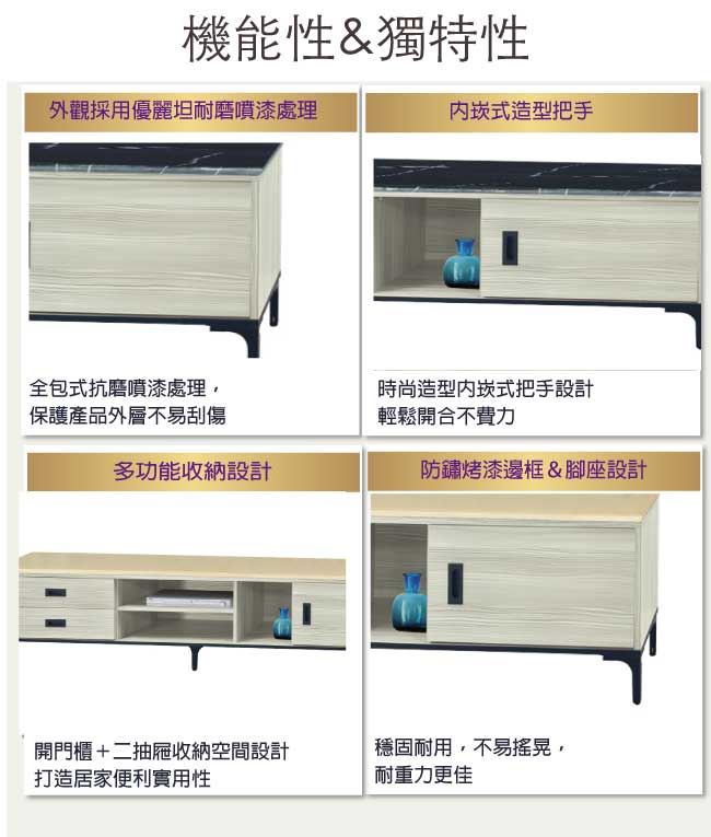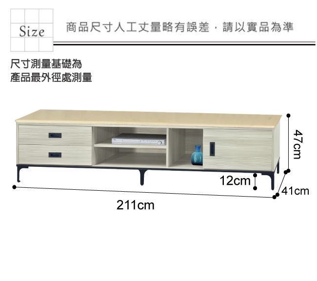 材質 | ◆產品名稱: 【綠家居】多巴納 單門7尺石面二抽電視櫃(二色石面可選) 尺寸:(寬)211x(深)41x(高)47/公分 ◆材質: 材質:防蛀木心板+黑鐵砂框架&腳座+五金滑軌結構+12mm雲紋石面板 噴漆:防潮耐磨噴漆處理