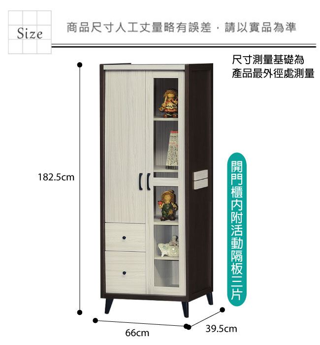 材質 | ◆產品名稱: 【綠家居】塞加 雙色2.2尺二門二抽高展示櫃 尺寸:(寬)66x(深)39.5x(高)182.5/公分 ◆材質: 材質:防蛀木心板+防潮黑漆腳座+五金滑軌結構+防夾手緩衝門片五金 噴漆:防潮耐磨噴漆處理