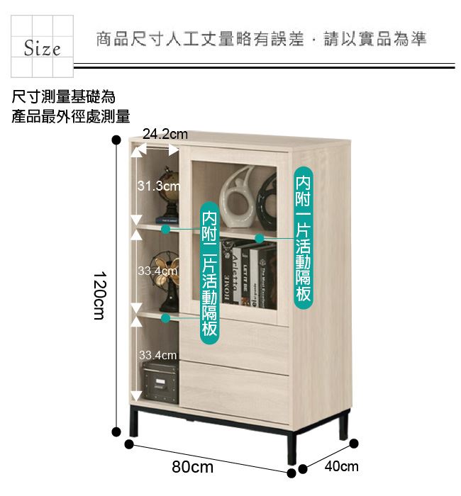 材質 | ◆產品名稱: 【綠家居】曼克特 時尚2.7尺單門二抽展示櫃/收納櫃 展示櫃尺寸:(寬)80x(深)40x(高)120/公分 ◆材質: 材質:防蛀木心板+黑鐵砂框架&腳座+五金滑軌結構+防夾手緩衝門片五金 噴漆:防潮耐磨噴漆處理