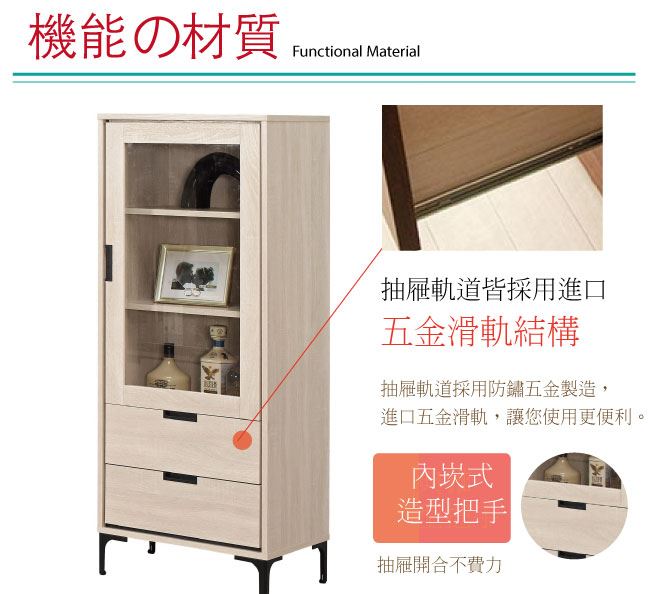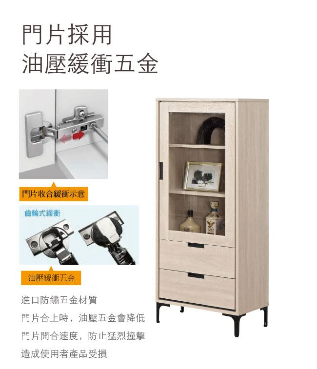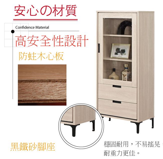 商品介紹 | 【綠家居】柏麗 淺橡1.8尺二門二抽展示櫃 淺橡木紋色系+現代簡約風格+安心材質製造,整體採用防蛀木心板+黑鐵砂腳座+防夾手緩衝門片五金+五金滑軌結構等安心材質製造,外層採用優利坦全包式耐磨噴漆處理搭配開門櫃+二抽屜+內開放式收納等收納空間設計,全由專人配送到家,專業安心服務,替你省下更多時間! 【商品特色】 淺橡木紋色系+現代簡約風格+安心材質製造,使用放心+搭配居家更便利 採用防蛀木心板+黑鐵砂腳座+防夾手緩衝門片五金等+五金滑軌結構安心材質製造 開門櫃+二抽屜+內開放式收納等收納空間設計 此商品不需要DIY組立,此商品為組立後之成品 品質保證、專業設計、貼心服務 全由專人配送到家,專業安心服務,替您省下更多時間 |