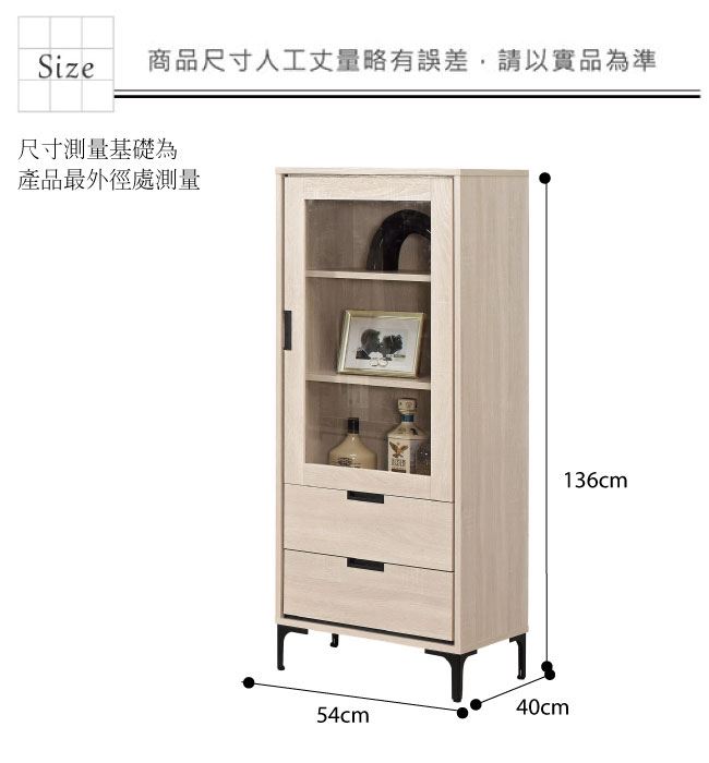 材質 | ◆產品名稱: 【綠家居】柏麗 淺橡1.8尺二門二抽展示櫃 產品尺寸: 尺寸:(寬)54x(深)40x(高)136/公分 ◆材質: 材質:防蛀木心板+黑鐵砂腳座 材質:防夾手緩衝門片五金+五金滑軌結構 塗漆:優利坦全包式耐磨噴漆處理