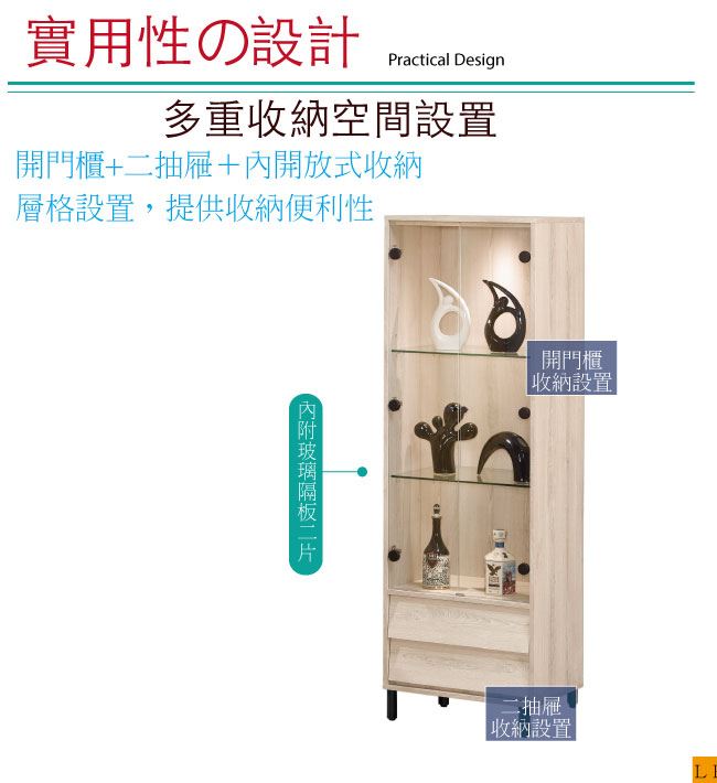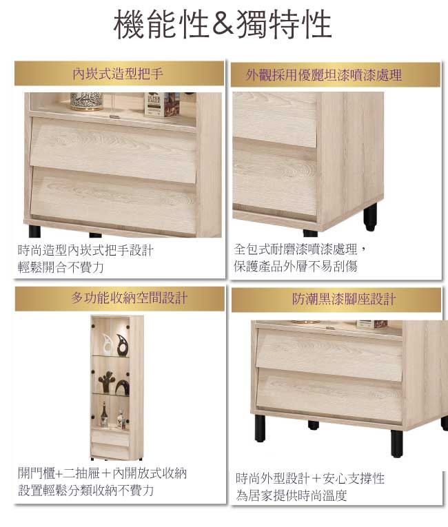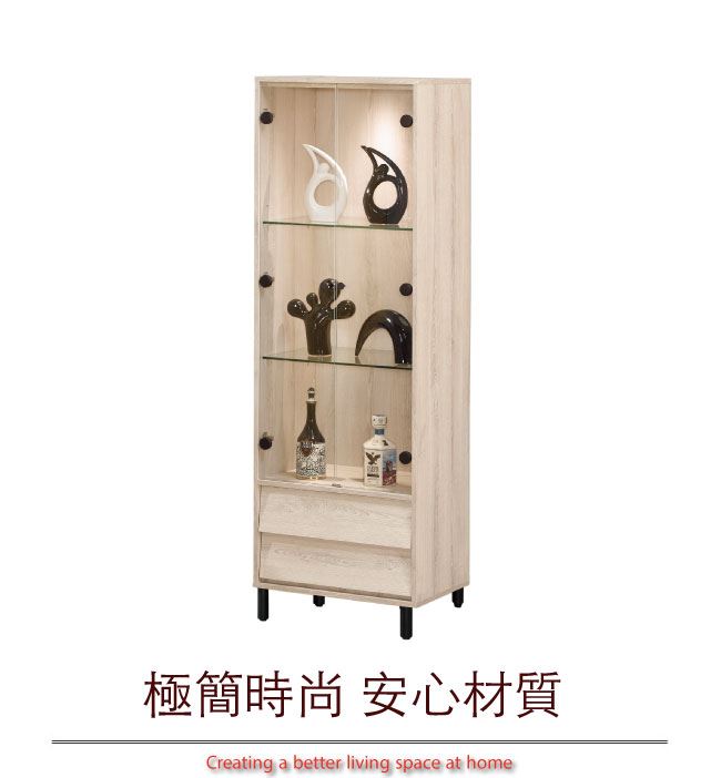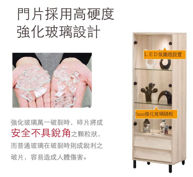 商品介紹 | 【綠家居】羅蒂卡 淺橡2尺二門二抽展示櫃/收納櫃 淺橡木紋色系+現代簡約風格+安心材質製造,整體採用防蛀木心板+五金滑軌結構+黑鐵砂腳座+防夾手緩衝門片五金+強化玻璃門片等安心材質製造,外層採用優利坦全包式耐磨噴漆處理搭配開門櫃+二抽屜+內&外開放式收納+LED氛圍燈設置等收納設計,全由專人配送到家,專業安心服務,替你省下更多時間! 【商品特色】 淺橡木紋色系+現代簡約風格+安心材質製造,使用放心+搭配居家更便利 採用防蛀木心板+五金滑軌結構+黑鐵砂腳座+防夾手緩衝門片五金+強化玻璃門片等安心材質製造 開門櫃+二抽屜+內&外開放式收納+LED氛圍燈設置等收納設計 此商品不需要DIY組立,此商品為組立後之成品 品質保證、專業設計、貼心服務 全由專人配送到家,專業安心服務,替您省下更多時間 |