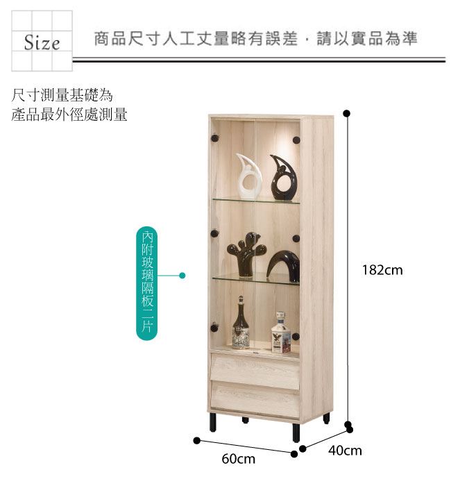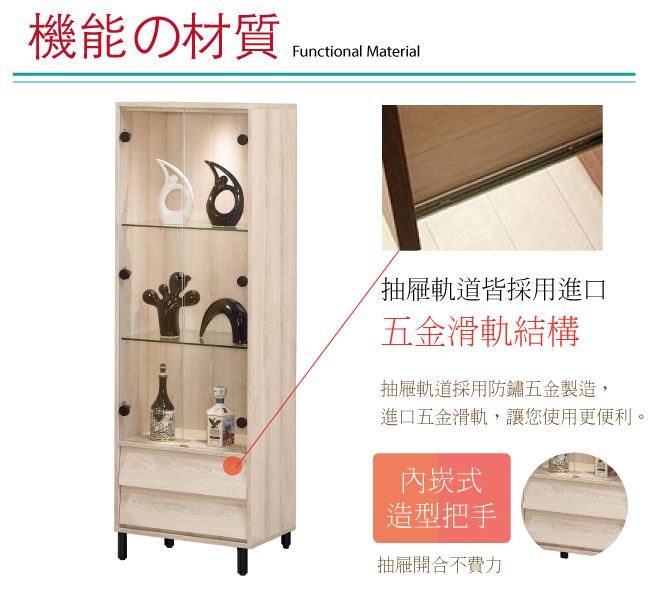 材質 | ◆產品名稱: 【綠家居】羅蒂卡 淺橡2尺二門二抽展示櫃/收納櫃 產品尺寸: 尺寸:(寬)60x(深)40x(高)182公分 ◆材質: 材質:防蛀木心板+黑鐵砂腳座 材質:五金滑軌結構+防夾手緩衝門片五金 +強化玻璃門片 塗漆:優利坦全包式耐磨噴漆處理