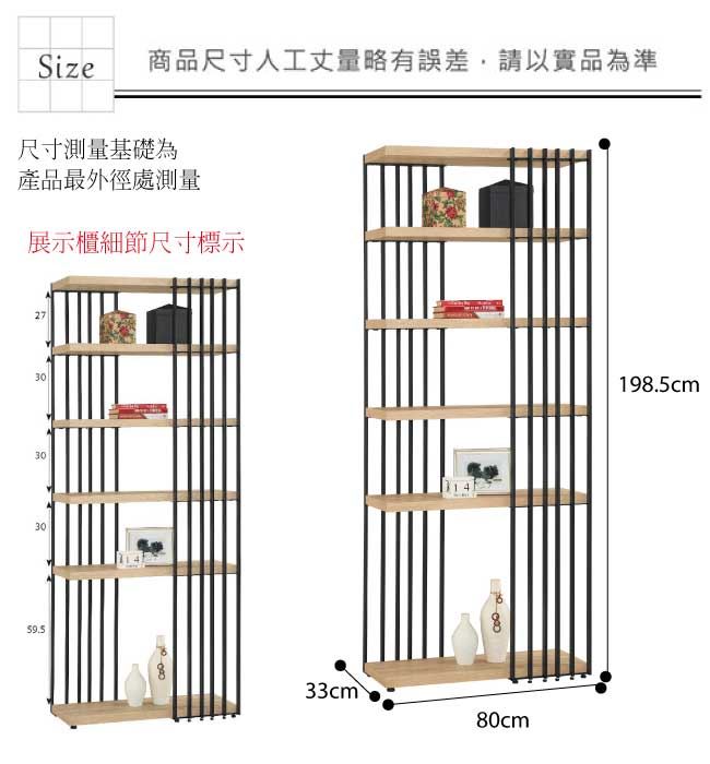 材質 | ◆產品名稱: 【綠家居】喬愛莎 時尚2.7尺開放式五格高展示櫃/收納櫃(二色可選) 產品尺寸: 尺寸:(寬)80x(深)33x(高)198.5公分 ◆材質: 材質:防潮MDF板材+黑鐵砂邊框&腳座 塗漆:優利坦全包式耐磨噴漆處理