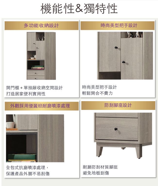 商品 介紹 | 【綠家居】約納 時尚2尺二門二抽展示櫃/收納櫃 橡木紋色系+現代簡約風格+安心材質製造,整體採用防蛀木心板+防夾手緩衝門片五金結構+防潮耐磨腳座+五金滑軌結構等安心材質製造,搭配採用開門櫃+二抽屜+開放式層格等收納空間設計,全由專人配送到家,專業安心服務,替你省下更多時間! 【商品特色】 橡木紋色系+現代簡約風格+安心材質製造,使用放心+搭配居家更便利 採用防蛀木心板+防夾手緩衝門片五金結構+防潮耐磨腳座+五金滑軌結構等安心材質製造 採用開門櫃+二抽屜+開放式層格等收納空間設計 此商品不需要DIY組立,此商品為組立後之成品 品質保證、專業設計、貼心服務 全由專人配送到家,專業安心服務,替您省下更多時間 |