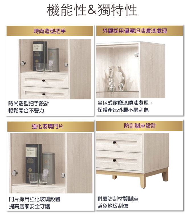 商品 介紹 | 【綠家居】范辛頓 時尚2尺二門二抽展示櫃/收納櫃 淺橡木紋色系+現代簡約風格+安心材質製造,整體採用防蛀木心板+防潮耐磨腳座+防夾手緩衝門片五金+五金滑軌結構+強化玻璃門片等安心材質製造,產品外層採用防潮耐磨噴漆處理搭配採用開門櫃+LED氛圍燈+二抽屜+內開放式收納層格等收納空間設計,全由專人配送到家,專業安心服務,替你省下更多時間! 【商品特色】 淺橡木紋色系+現代簡約風格+安心材質製造,使用放心+搭配居家更便利 採用防蛀木心板+防潮耐磨腳座+防夾手緩衝門片五金+五金滑軌結構+強化玻璃門片等安心材質製造 產品外層採用防潮耐磨噴漆處理 搭配採用開門櫃+LED氛圍燈+二抽屜+內開放式收納層格等收納空間設計 此商品不需要DIY組立,此商品為組立後之成品 品質保證、專業設計、貼心服務 全由專人配送到家,專業安心服務,替您省下更多時間 |