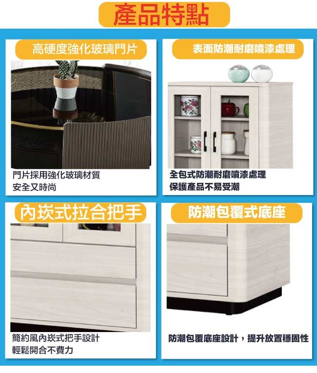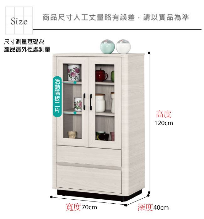 材質 | ◆產品名稱:【綠家居】巴卡莉2.3尺二門二抽展示櫃/收納櫃 尺寸:(寬)70x(深)40(高)120公分 ◆材質: 材質:防蛀木心板+防潮包覆式腳座+防夾手緩衝門片五金+五金滑軌結構 噴漆:防潮耐磨噴漆處理