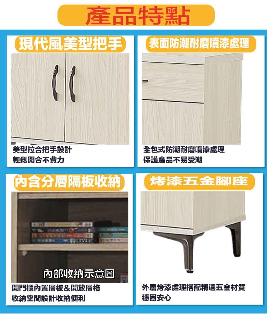 材質:防蛀木心板+烤漆金屬腳座+五金滑軌結構+防夾手緩衝門片五金