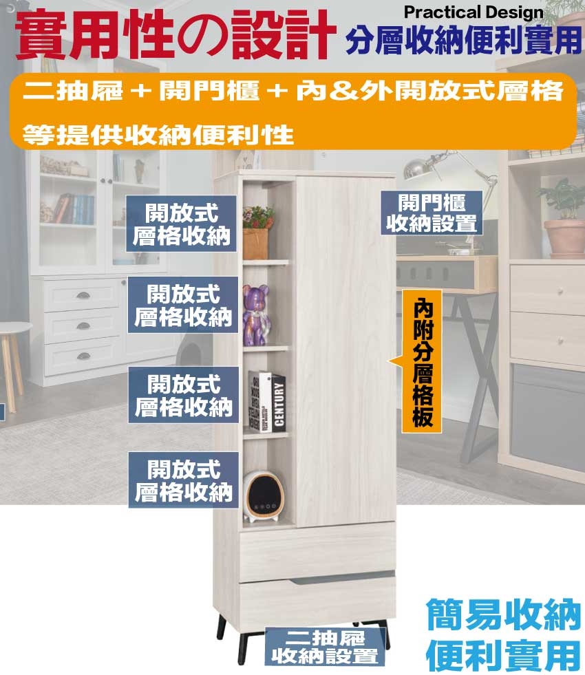 搭配採用開門櫃+二抽屜+內&外開放層格等收納空間設計