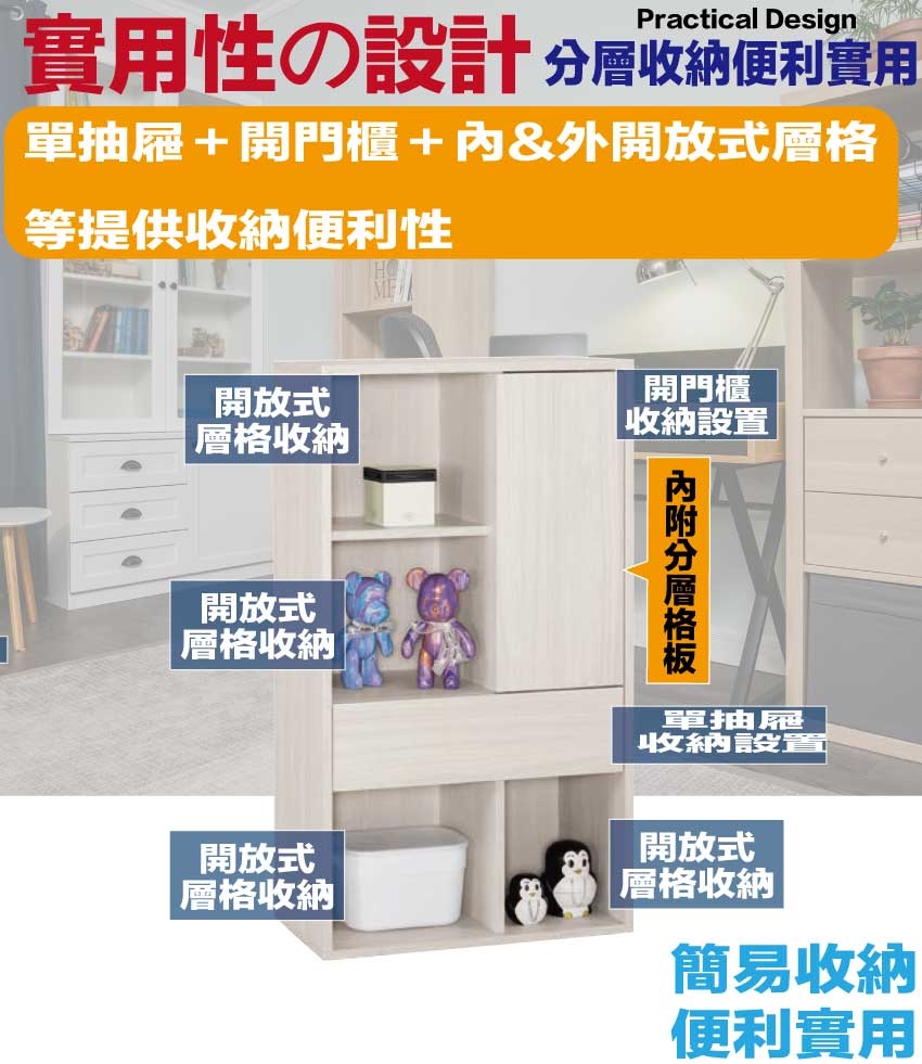 搭配採用開門櫃+單抽屜+內&外開放層格等收納空間設計
