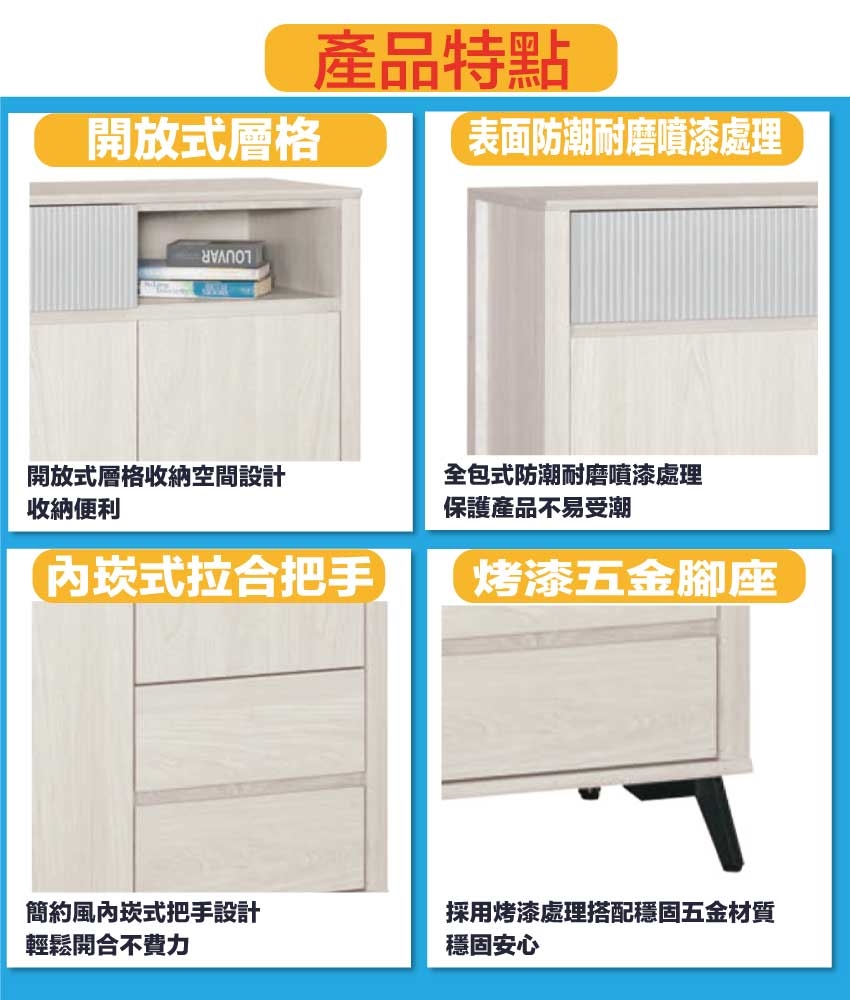 材質:防蛀木心板+防潮MDF板材(灰色耐磨面板)+烤漆五金腳座+防夾手緩衝門片五金+五金滑軌結構