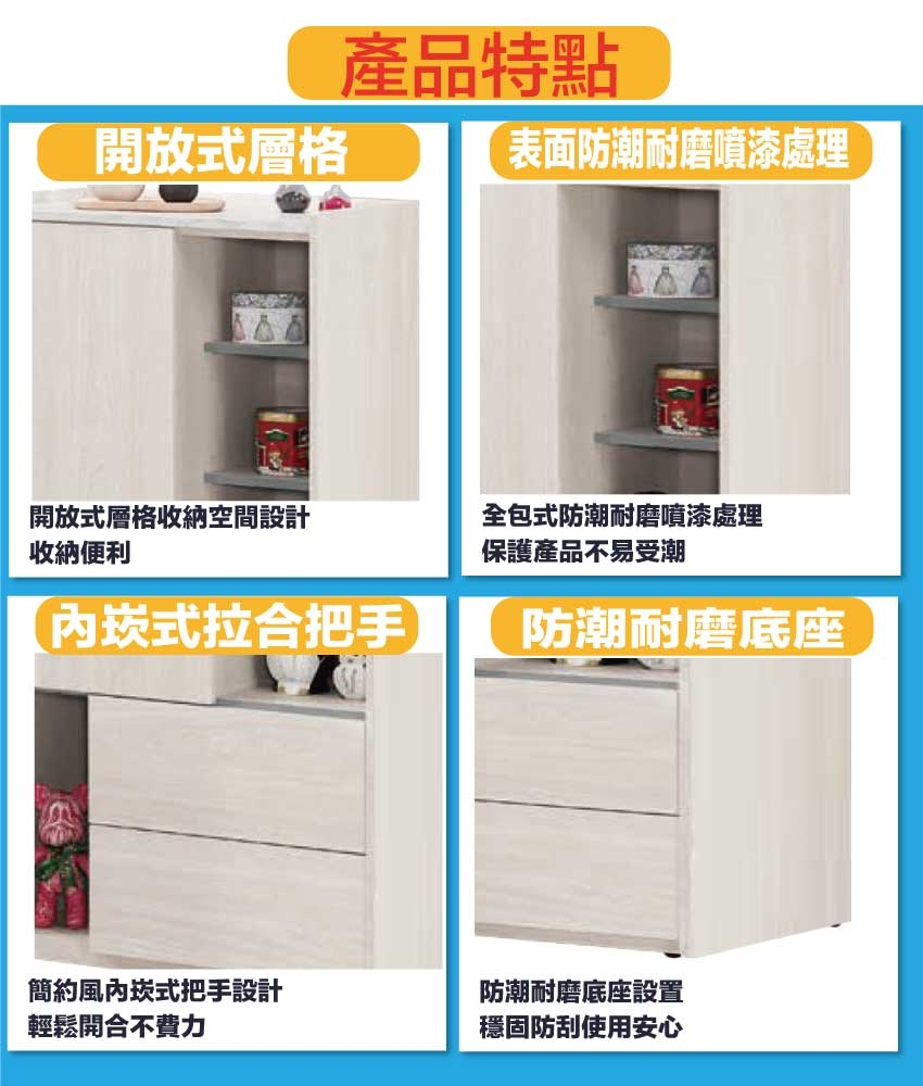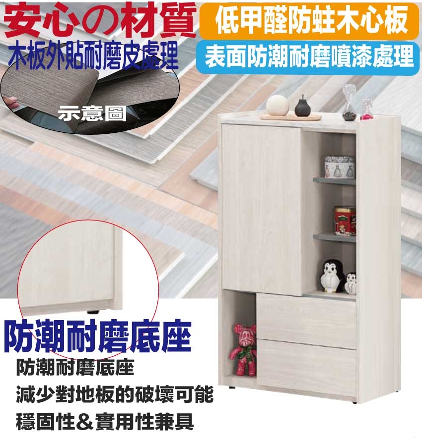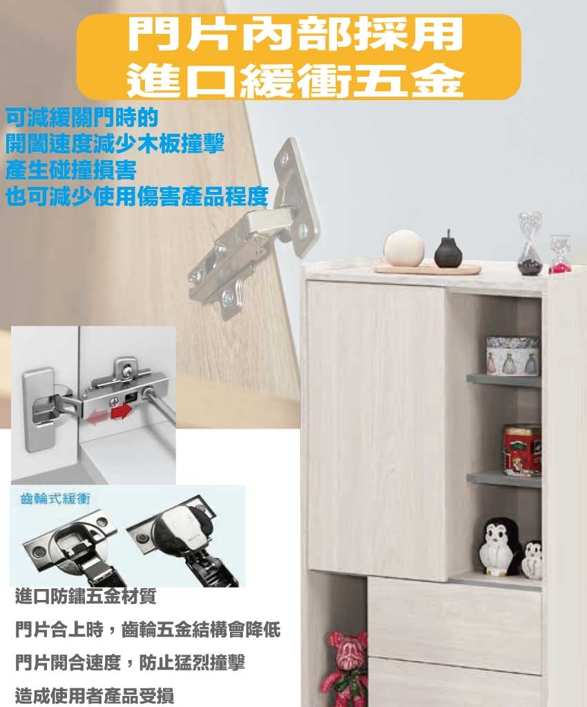 材質:防蛀木心板+防潮耐磨底座+防夾手緩衝門片五金+五金滑軌結構