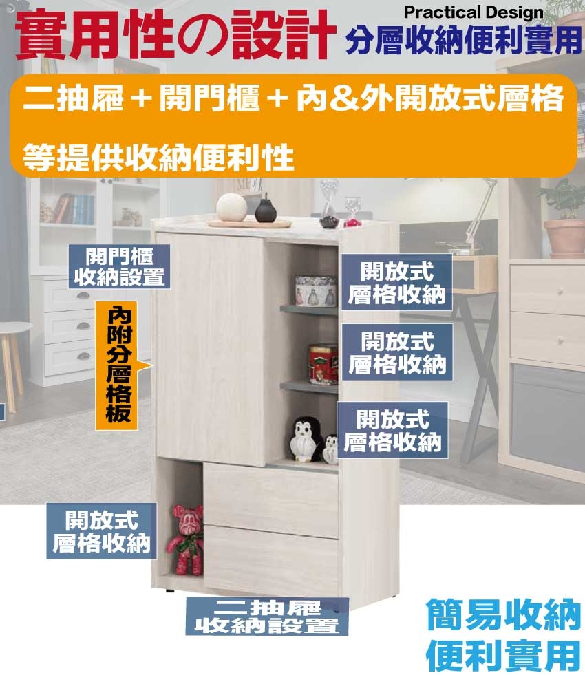 搭配採用開門櫃+二抽屜+內&外開放層格等收納空間設計