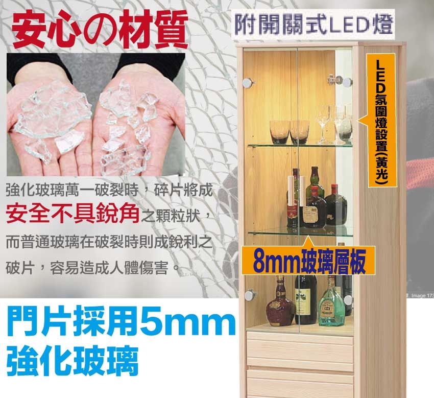 採用紐松木實木+防蛀木心板+防刮實木腳座+五金滑軌結構+防夾手環衝門片五金+強化玻璃鏡面等安心材質製造