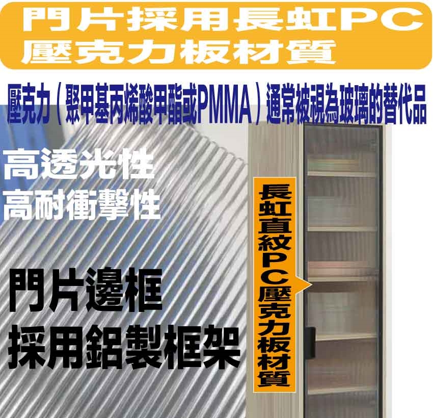 材質:防蛀木心板+防潮耐磨腳座+黑漆鋁製門框+長虹PC材質門片+防夾手緩衝門片五金