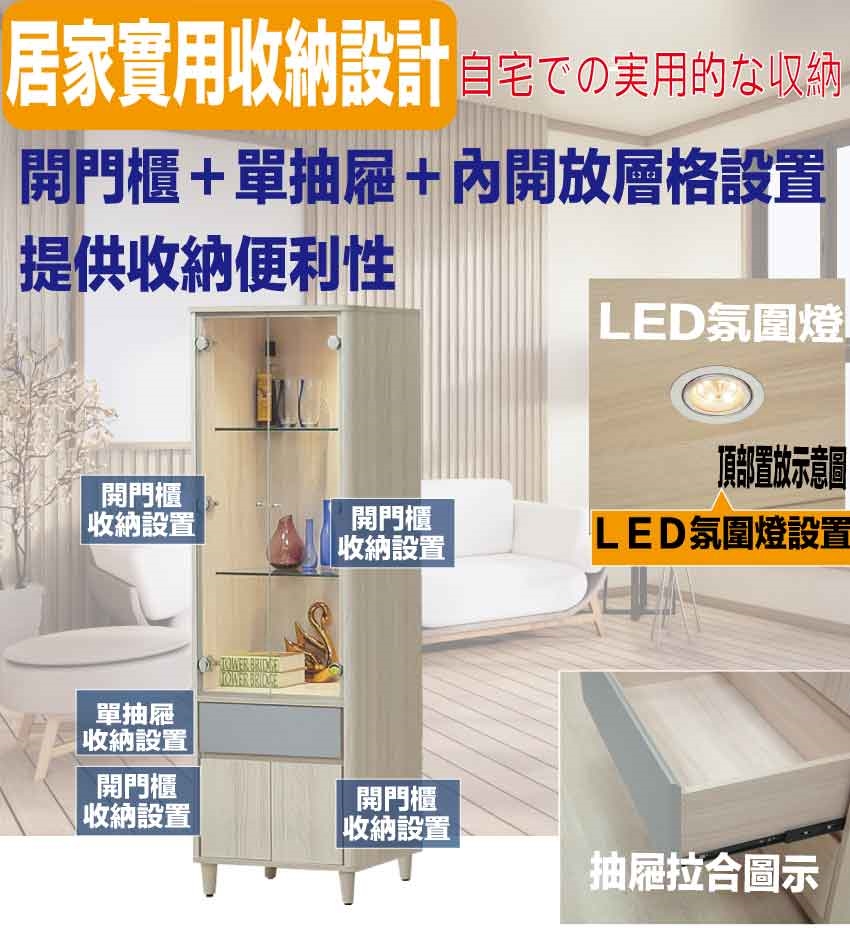 搭配採用開門櫃+單抽屜+內開放層格+內附LED氛圍燈等收納空間設計