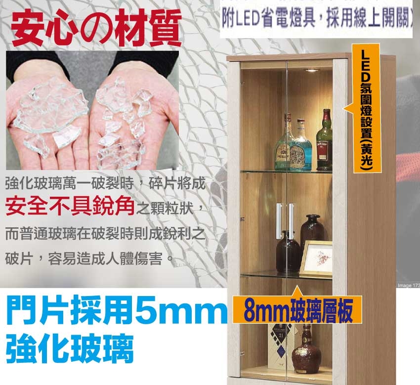 材質:防蛀木心板+防潮MDF板+防潮耐磨底座+5mm強化玻璃門片+8mm強化玻璃層板+內置LED氛圍燈