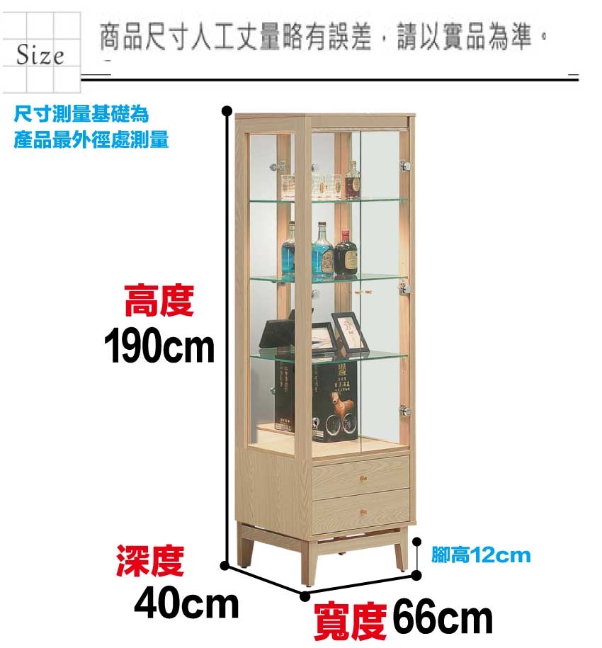 尺寸:(寬)66x(深)40x(高)190/公分 ◆材質: 材質:防蛀木心板+防潮耐磨腳座+五金滑軌結構+強化玻璃門片 噴漆:防潮耐磨噴漆處理 ◎注意事項: 1.接單後,會有專員與您電聯確認送貨時間。 2.需以吊車吊運以當地吊車行情計,費用由消費者支付。 3.備註:本商品不含圖片上、家飾...等,情境圖之內容僅供參考。 4.請於配送人員到場時,檢查商品有無缺失,以免造成爭議。 5.允許的誤差尺寸範圍+-2%。 6.因拍攝燈光與電腦解析度瑩幕不同可能會造成實品與網頁上商品有些許色差,商品以收到實品為主。 ◎收貨與退貨: 1.實因特殊地型限制及(山區、濱海鄉、鎮、村、區)無法送貨時,本公司保有出貨與否之權利(下單後會由專人告知是否可配送)。 2.有電梯不收取費用! 無電梯樓層超過4樓以上(包含4樓)一樓層費用200元,現場支付給服務員。 3.超過鑑賞期,恕不接受退貨。 4.限非人為因素破壞毀損,才可退貨。 5.若退貨時,收件時間請與廠商協調,確保自己權益。 6.退貨時應保留贈品及附件完整(如有遺失部分,需酌收費用)。 ◎備註: .無回收服務。 .收貨與退貨:實因特殊地型限制及(山區、濱海鄉、鎮、村、區)無法送貨時,本公司保有出貨與否之權利(下單後會由專人告知是否可配送)。 .花蓮(縣市)、台東(縣市)、屏東(縣市場及其它縣市屬於山區、濱海鄉、鎮、村地區無配送服務,如您有需求,則需另外收取運費。(您可直接訂購,後續由廠商報價。) ※由於加價配送服務為一次消耗性商品,若有退換貨等情形加購之運費恕無法退還 ※運費報價皆為單趟計算。 ※使用加價配送地區,收貨時間會比一般地區再增加10個工作天。