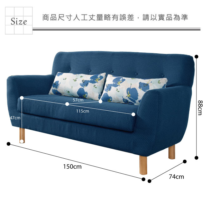沙發尺寸:(寬)150x (深)74x (高)88 公分