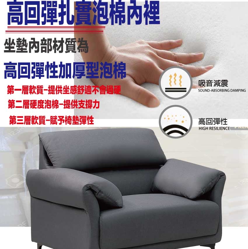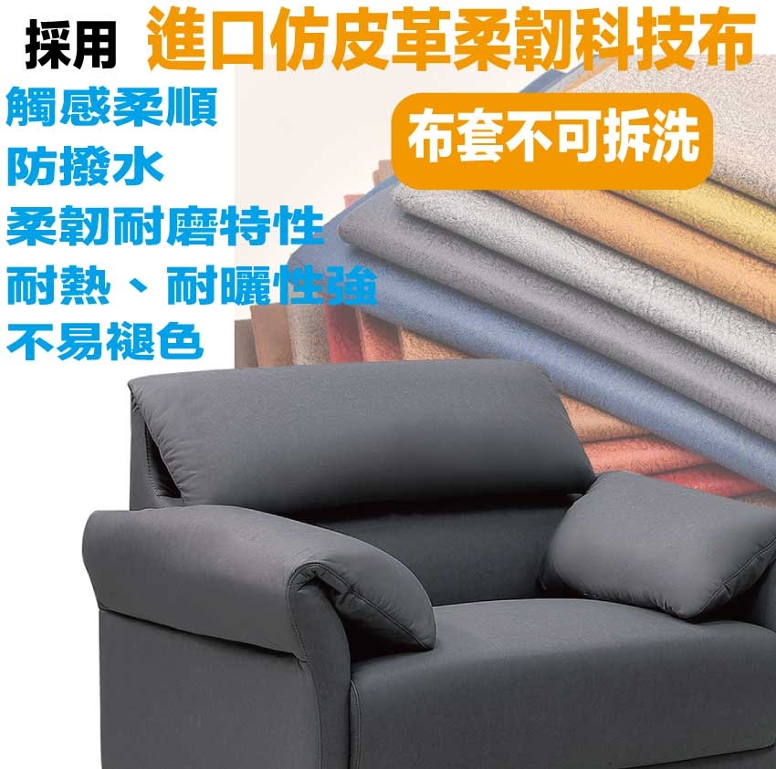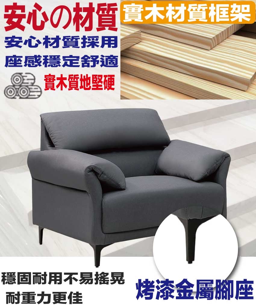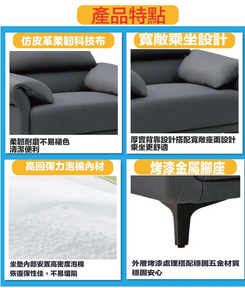 採用內部實木框架+烤漆金屬腳座+柔韌仿皮革科技布料+高回彈泡棉等安心材質製造