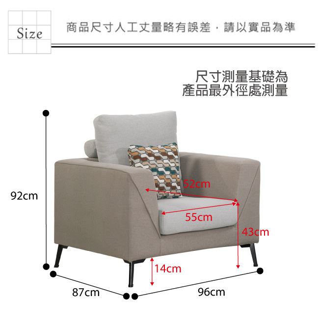 材質 | ◆產品名稱:【綠家居】 阿爾澤 時尚雙色可拆洗棉麻布獨立筒單人座沙發椅 產品尺寸: 1人座尺寸:(寬)96x(深)87x(高)92公分 材質:桐木實木骨架椅身+黑鐵砂腳座 材質:可拆洗棉麻布+獨立筒彈簧座包 坐墊:三層式高密度泡棉+絲棉 |