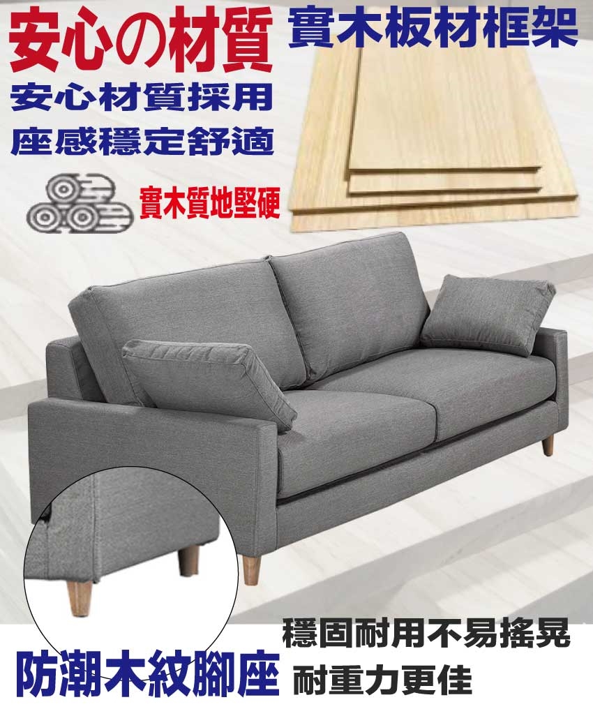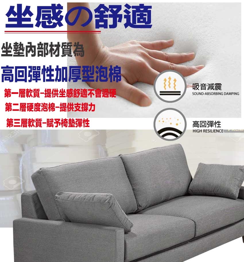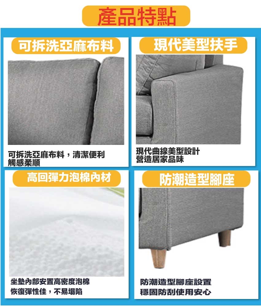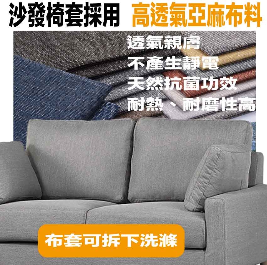 採用內部實木板材框架+防潮木紋腳座+透氣亞麻布(可拆洗)+高回彈泡棉等安心材質製造