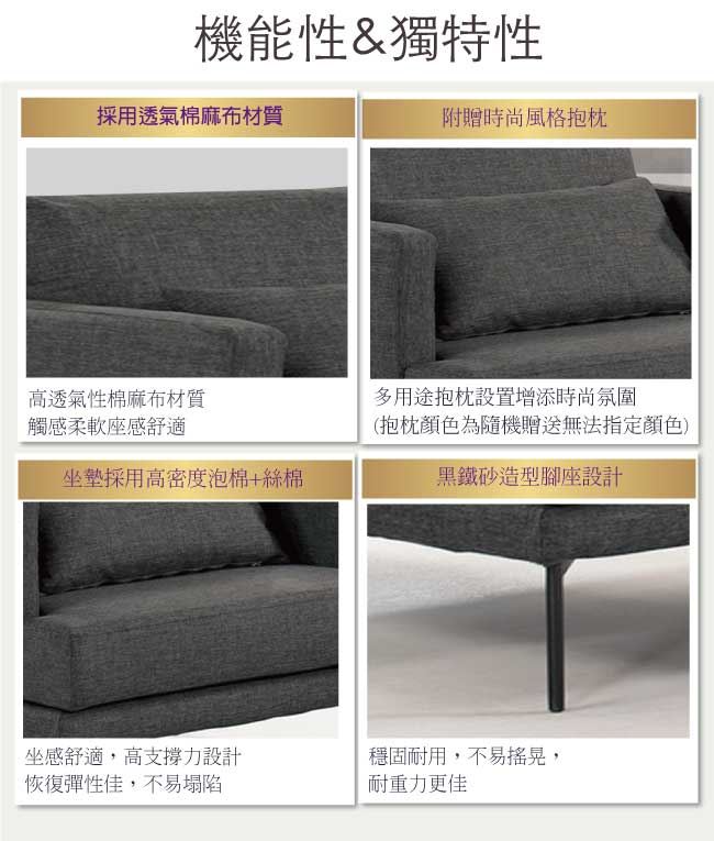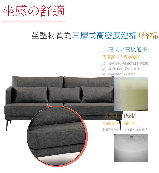 商品 介紹 | 【綠家居】米卡瑪深灰透氣棉麻布三人座沙發椅 深灰色系+現代美型外觀+安心材質設計,就是這種頂級質感的設計,能輕鬆地融入各種空間風格,採用實木骨架椅身+黑鐵砂腳座+透氣棉麻布+高密度三層式泡棉等安心材質,品質安心有保障,現在購買專人送到府服務,免組裝+免運費,讓你省時省力省運費! 【商品特色】 深灰色系+現代美型外觀+安心材質設 實木骨架椅身+黑鐵砂腳座+透氣棉麻布+高密度三層式泡棉等安心材質 專人送貨到府免組裝免運費服務,讓您省時又便利 |
