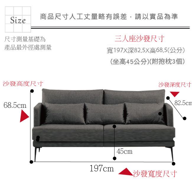 材質 | ◆產品名稱: 【綠家居】米卡瑪深灰透氣棉麻布三人座沙發椅 產品尺寸: 沙發尺寸:(寬)197x(深)82.5x(高)68.5/公分 材質:實木骨架椅身+黑鐵砂腳座 布料:透氣棉麻布 坐墊:三層式高密度泡棉+絲棉
