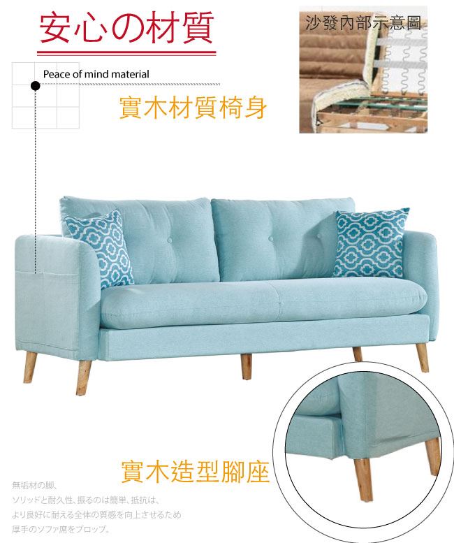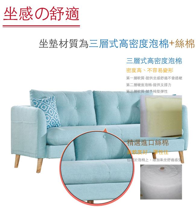 商品介紹 | 【綠家居】敦斯登 簡約可拆洗棉麻布獨立筒三人沙發椅 高格調水藍色系+現代美型外觀+安心材質設計,就是這種頂級質感的設計,能輕鬆地融入各種空間風格,採用松木實木骨架&椅身+可拆洗棉麻布+防潮實木腳座+高密度三層式泡棉+獨立筒彈簧座包等安心材質,品質安心有保障,現在購買專人送到府服務,免組裝+免運費,讓你省時省力省運費! 【商品特色】 高格調水藍色系+現代美型外觀+安心材質設計 松木實木骨架&椅身+可拆洗棉麻布+防潮實木腳座+高密度三層式泡棉+獨立筒彈簧座包等安心材質 專人送貨到府免組裝免運費服務,讓您省時又便利 |