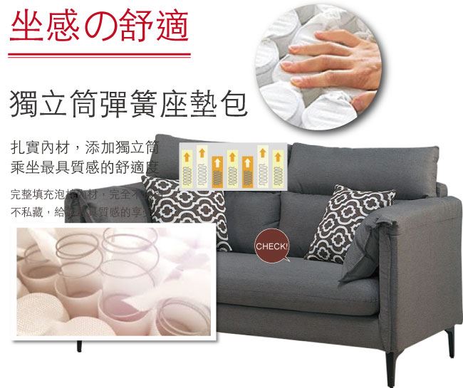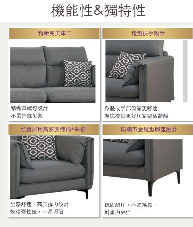 商品介紹 | 【綠家居】利馬 時尚灰可拆洗亞麻布獨立筒三人座沙發椅 時尚灰色系+現代美型外觀+安心材質設計,就是這種頂級質感的設計,能輕鬆地融入各種空間風格,採用松木實木骨架&椅身+可拆洗亞麻布+黑鐵砂腳座+高密度三層式泡棉+獨立筒彈簧座包等安心材質,品質安心有保障,現在購買專人送到府服務,免組裝+免運費,讓你省時省力省運費! 【商品特色】 時尚灰色系+現代美型外觀+安心材質設計 松木實木骨架&椅身+可拆洗亞麻布+黑鐵砂腳座+高密度三層式泡棉+獨立筒彈簧座包等安心材質 專人送貨到府免組裝免運費服務,讓您省時又便利 |