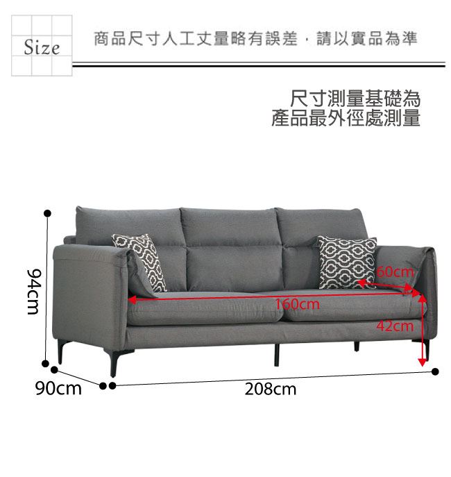 材質 | ◆產品名稱:【綠家居】 利馬 時尚灰可拆洗亞麻布獨立筒三人座沙發椅 產品尺寸: 3人座尺寸:(寬)208x(深)90x(高)94公分 材質:桐木實木骨架椅身+黑鐵砂腳座 材質:可拆洗亞麻布+獨立筒彈簧座包 坐墊:三層式高密度泡棉+絲棉 |