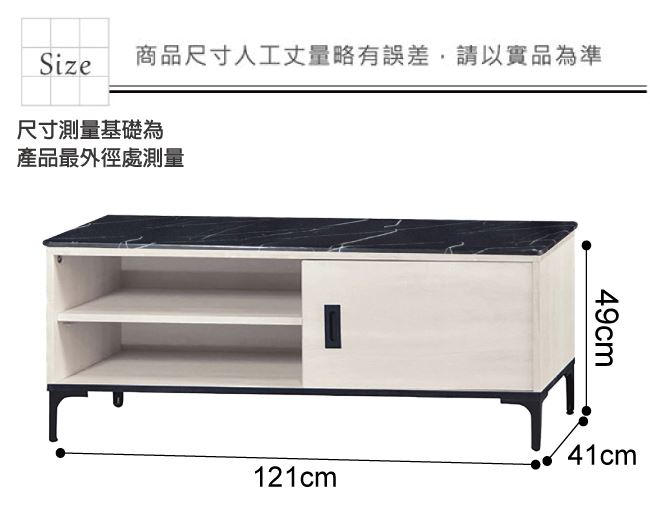 材質 | ◆產品名稱:【綠家居】亞塞 現代4尺雲紋石面電視櫃/視聽櫃(三色可選) 電視櫃尺寸:(寬)121x(深)41x(高)49/公分 ◆材質: 材質:防夾手緩衝門片五金+黑鐵砂腳座+防蛀木心板+2cm雲紋石面 塗漆:優利坦三層全包式耐磨塗漆塗裝處理 |