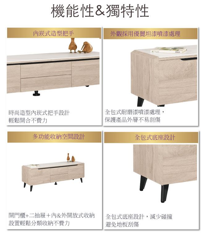 商品介紹 | 【綠家居】卡蘭 岩板4.9尺二門二抽電視櫃/視聽櫃 橡木紋色系+現代簡約風格+安心材質製造,整體採用防蛀木心板+五金滑軌結構+黑鐵砂腳座+12mm岩板桌面板+防夾手緩衝門片五金等安心材質製造,外層採用優利坦全包式耐磨噴漆處理搭配開門櫃+二抽屜+內開放式收納等收納設計,全由專人配送到家,專業安心服務,替你省下更多時間! 【商品特色】 橡木紋色系+現代簡約風格+安心材質製造,使用放心+搭配居家更便利 採用防蛀木心板+五金滑軌結構+黑鐵砂腳座+12mm岩板桌面板+防夾手緩衝門片五金等安心材質製造 開門櫃+二抽屜+內開放式收納等收納設計 此商品不需要DIY組立,此商品為組立後之成品 品質保證、專業設計、貼心服務 全由專人配送到家,專業安心服務,替您省下更多時間 |