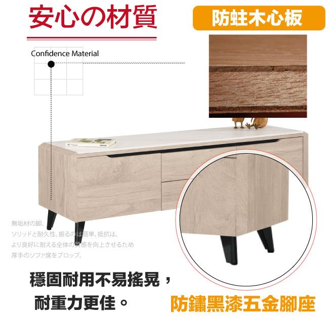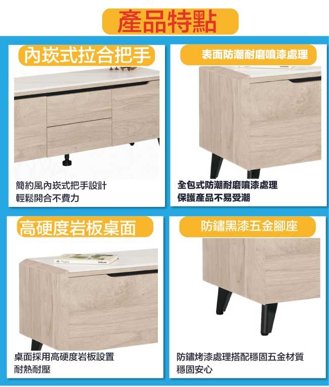 商 品 介 紹 | 【綠家居】麥格妮岩板4.9尺二門二抽電視櫃/視聽櫃 淺橡木紋色系+現代簡約風格+安心材質製造,使用放心+搭配居家更便利,整體採用防蛀木心板+防鏽黑漆五金腳座+五金滑軌結構+12mm高硬度岩板桌面板等材質搭配外層採用優莉坦耐磨全包式噴漆處理 ,採用開門櫃+二抽屜+開放式收納等收納空間設計,全由專人配送到家,專業安心服務,替你省下更多時間! 【商品特色】 淺橡木紋色系+現代簡約風格+安心材質製造,使用放心+搭配居家更便利 防蛀木心板+防鏽黑漆五金腳座+五金滑軌結構+12mm高硬度岩板桌面板等材質 採用開門櫃+二抽屜+開放式收納等收納空間設計 此商品不需要DIY組立,此商品為組立後之成品 品質保證、專業設計、貼心服務 全由專人配送到家,專業安心服務,替您省下更多時間