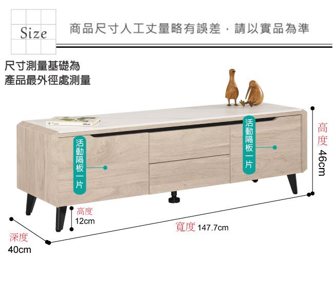 材質 | ◆產品名稱:【綠家居】麥格妮岩板4.9尺二門二抽電視櫃/視聽櫃 尺寸:(寬)147.7x(深)40(高)46公分 ◆材質: 材質:防蛀木心板+防鏽黑漆五金腳座+五金滑軌結構+12mm高硬度岩板桌面板 噴漆:防潮耐磨噴漆處理