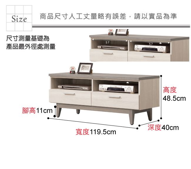 材質 | ◆產品名稱:【綠家居】芙娜雙色4尺二抽電視櫃/視聽櫃 尺寸:(寬)119.5x(深)40(高)48.5公分 ◆材質: 材質:防蛀木心板+防潮耐磨腳座+五金滑軌結構 噴漆:防潮耐磨噴漆處理