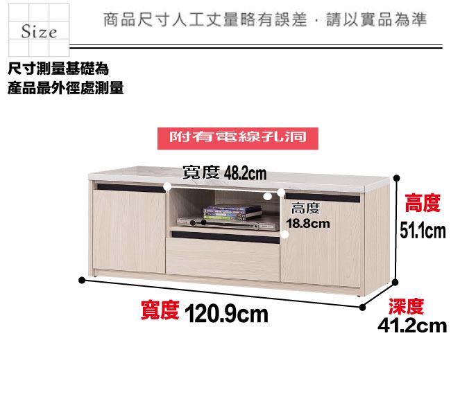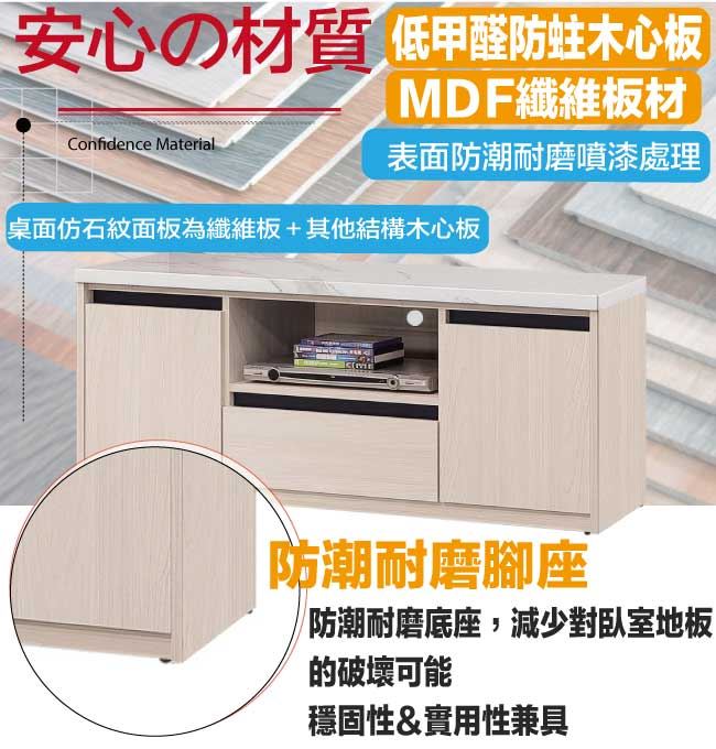 材質 | ◆產品名稱:【綠家居】麥森4尺二門單抽電視櫃 尺寸:(寬)120.9x(深)41.2(高)51.1/公分 ◆材質: 材質:防蛀木心板+防潮耐磨腳座+五金滑軌結構+防夾手緩衝門片五金+仿雲紋石紋路木質桌面板(MDF纖維板材質) 噴漆:防潮耐磨噴漆處理