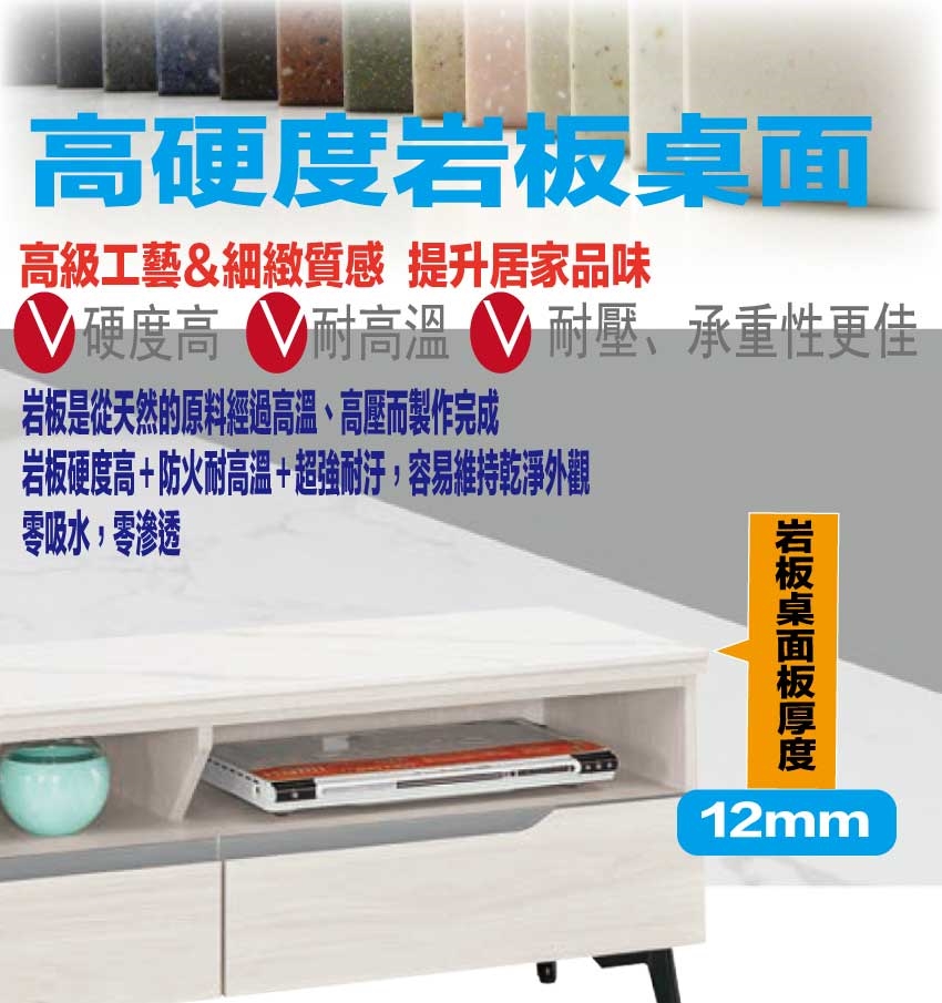 採用防蛀木心板+烤漆五金腳座+12mm高硬度岩板桌面板+五金滑軌結構等安心材質製造