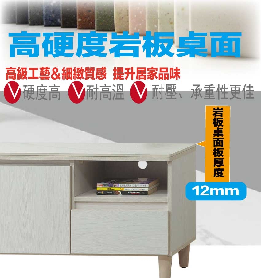 材質:防蛀木心板+防刮實木腳座+五金滑軌結構+防夾手環衝門片五金+12mm高硬度岩板桌面板