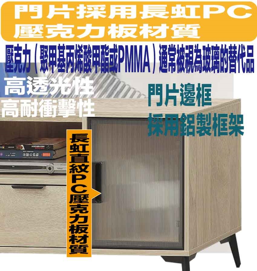 材質:防蛀木心板+烤漆五金腳座+黑漆鋁製門框+長虹PC材質門片+防夾手緩衝門片五金+五金滑軌結構