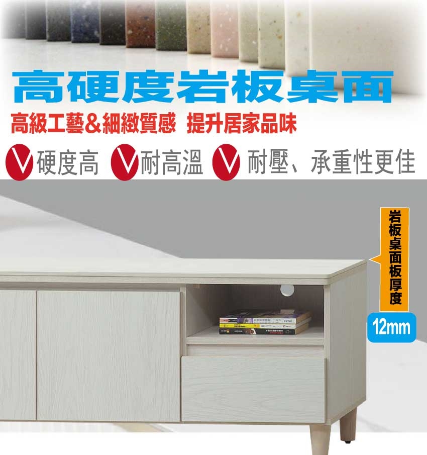 材質:防蛀木心板+防刮造型腳座+12mm高硬度岩板桌面板+防夾手緩衝五金