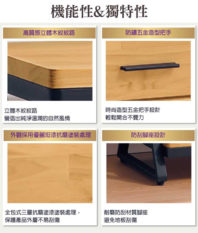 松木實木+防蛀木心板+黑鐵砂金屬腳座等材質,結構牢固耐用