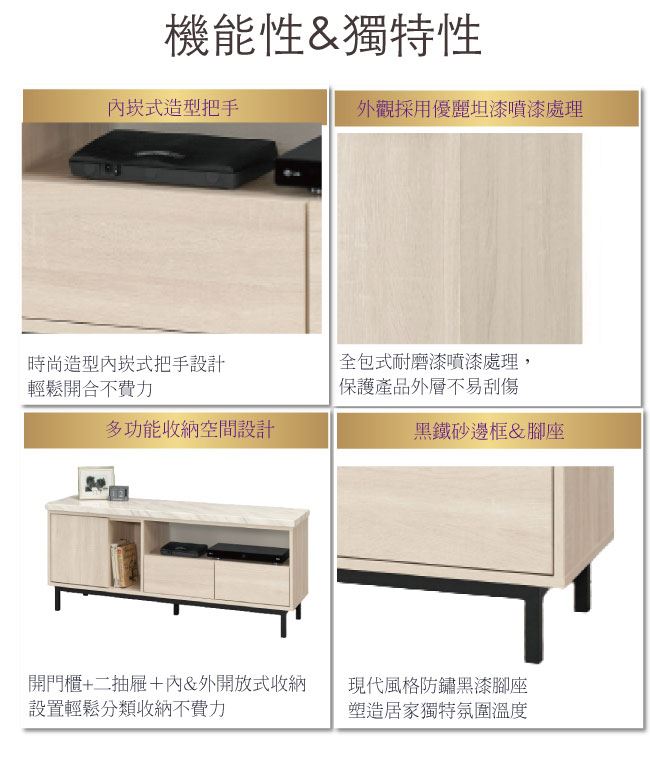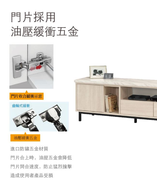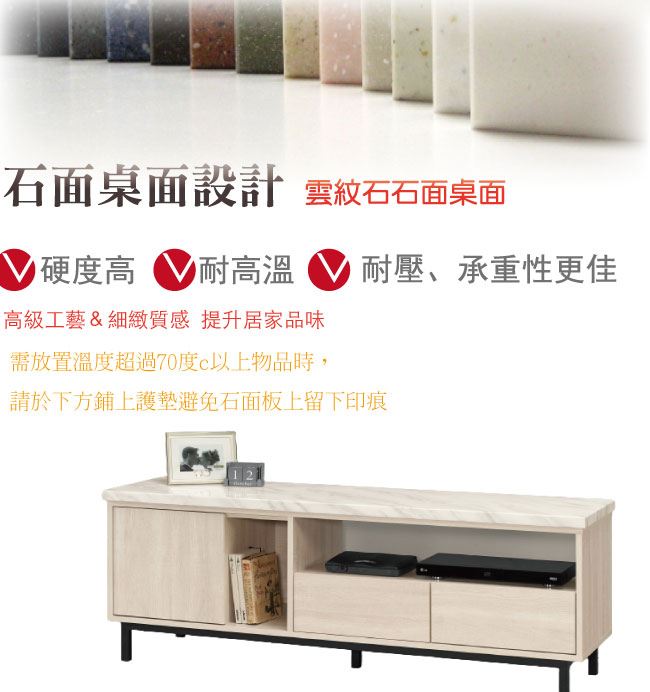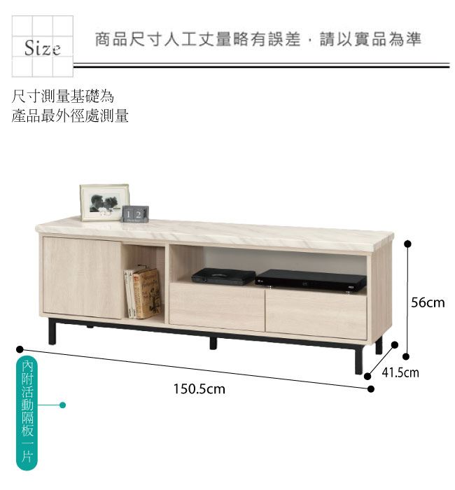 材質 | ◆產品名稱: 【綠家居】馬加柏 淺橡5尺雲紋石面電視櫃/視聽櫃 產品尺寸: 尺寸:(寬)150.5x(深)41.5x(高)56公分 ◆材質: 材質:防蛀木心板+黑鐵砂腳座+2cm雲紋石面桌面板 材質:五金滑軌結構+防夾手緩衝門片五金 塗漆:優利坦全包式耐磨噴漆處理