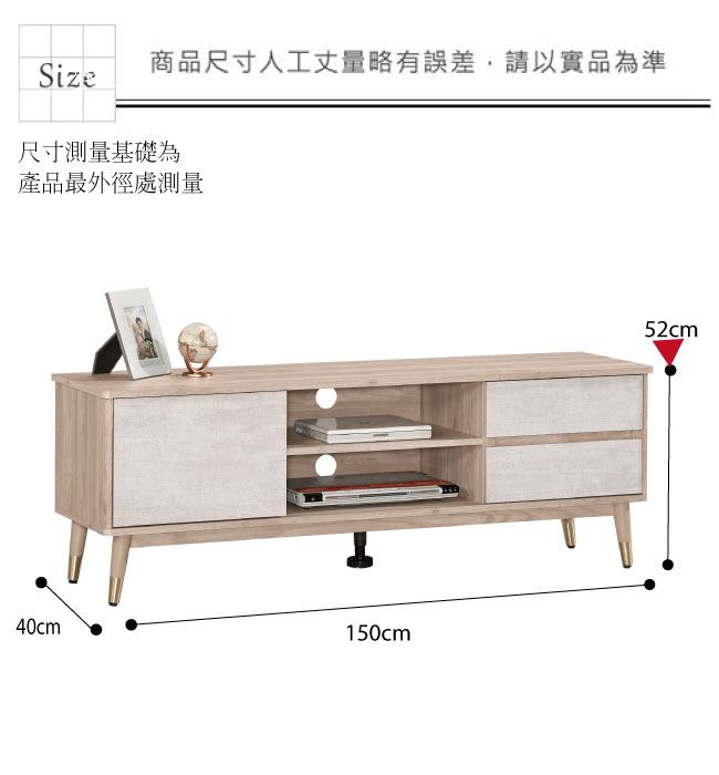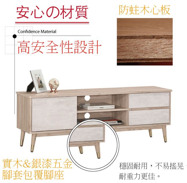 材質 | ◆產品名稱: 【綠家居】喬普 雙色5尺單門二抽電視櫃/視聽櫃 產品尺寸: 尺寸:(寬)150x(深)40x(高)52公分 ◆材質: 材質:防蛀木心板+防潮實木&銀漆五金腳套腳座+防夾手緩衝門片五金 材質:五金滑軌結構 塗漆:優利坦全包式耐磨噴漆處理
