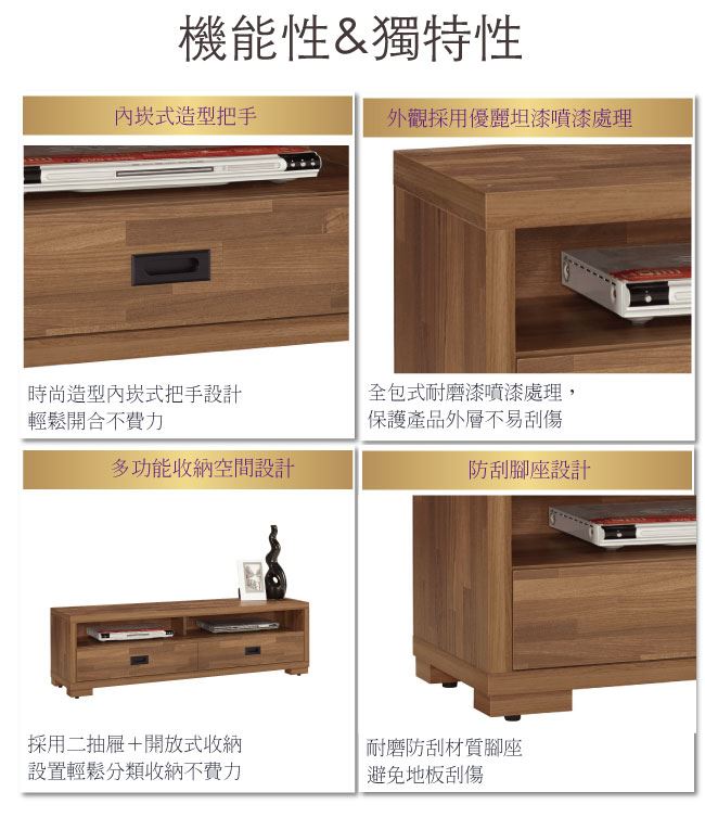 商品介紹 | 【綠家居】山普森 時尚5尺二抽電視櫃/視聽櫃(二色可選) 二色可選+現代簡約風格+安心材質製造,整體採用防蛀木心板+五金滑軌結構+防潮耐磨腳座等安心材質製造,外層採用優利坦全包式耐磨噴漆處理搭配二抽屜+內&外開放式收納等收納設計,全由專人配送到家,專業安心服務,替你省下更多時間! 【商品特色】 二色可選+現代簡約風格+安心材質製造,使用放心+搭配居家更便利 採用防蛀木心板+五金滑軌結構+防潮耐磨腳座等安心材質製造 二抽屜+內&外開放式收納等收納設計 此商品不需要DIY組立,此商品為組立後之成品 品質保證、專業設計、貼心服務 全由專人配送到家,專業安心服務,替您省下更多時間 |