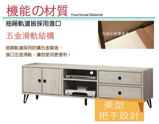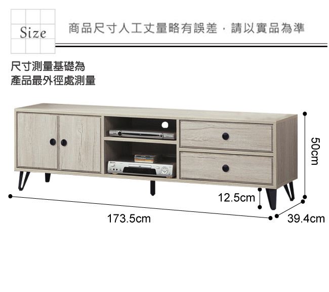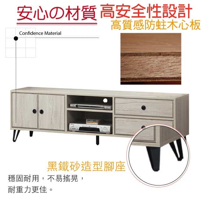 材質 | ◆產品名稱: 【綠家居】湯姆 時尚5.8尺二門二抽電視櫃 尺寸:(寬)173.5x(深)39.4x(高)50/公分 ◆材質: 材質:防蛀木心板+黑鐵砂腳座+五金滑軌結構+防夾手緩衝門片五金 噴漆:防潮耐磨噴漆處理