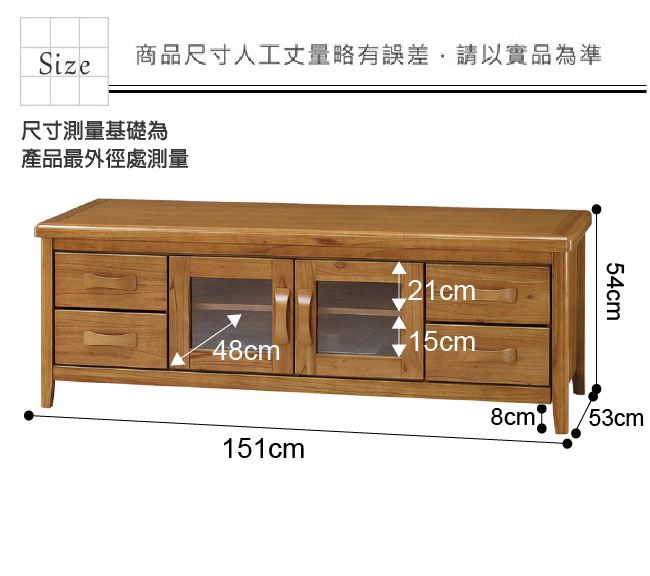 尺寸:(寬)151(深)53(高)54公分 ◆材質: 材質:苦齡木實木+防蛀木心板+防潮實木腳座+防夾手緩衝門片五金+五金滑軌結構 噴漆:防潮耐磨噴漆處理